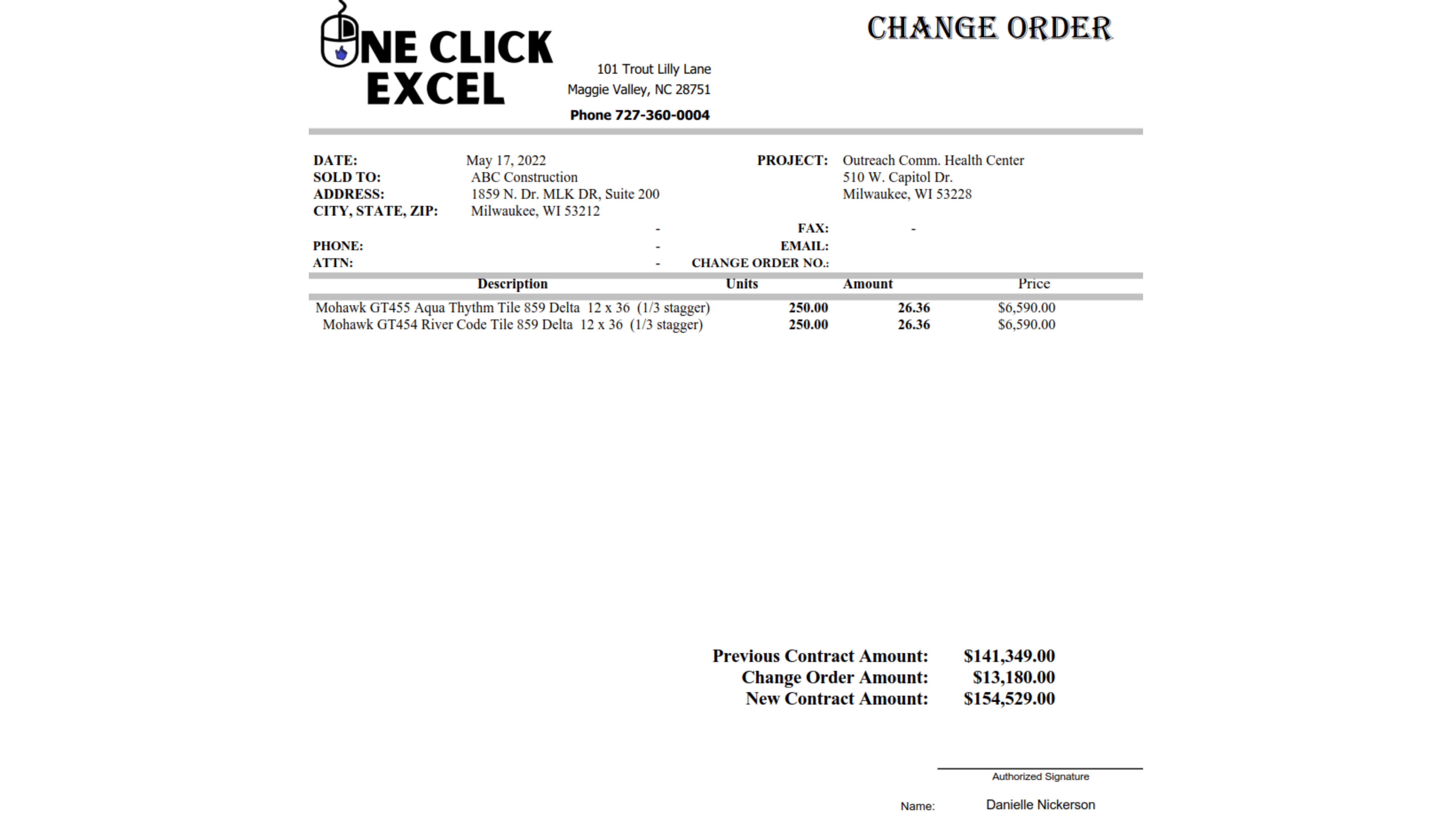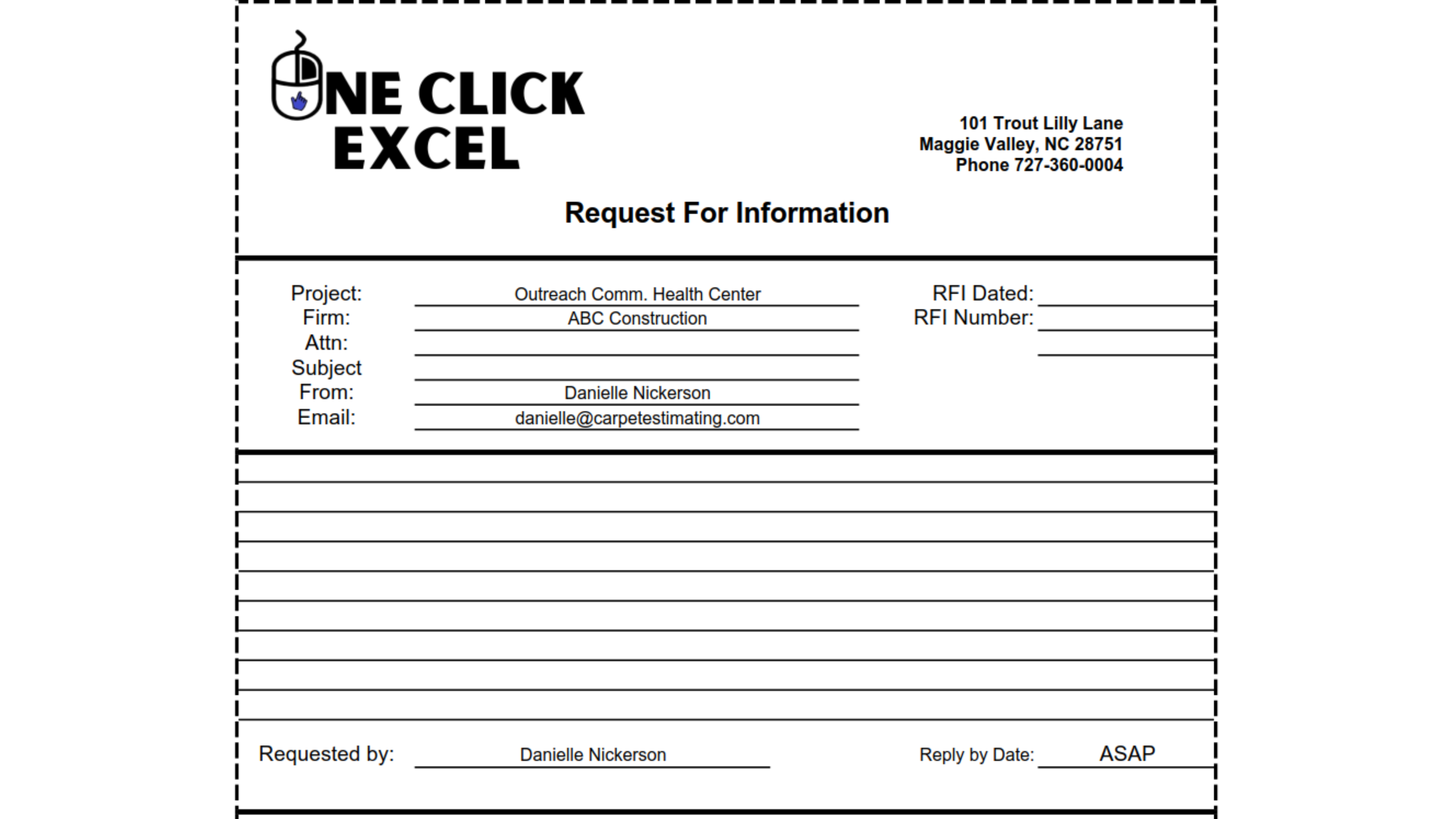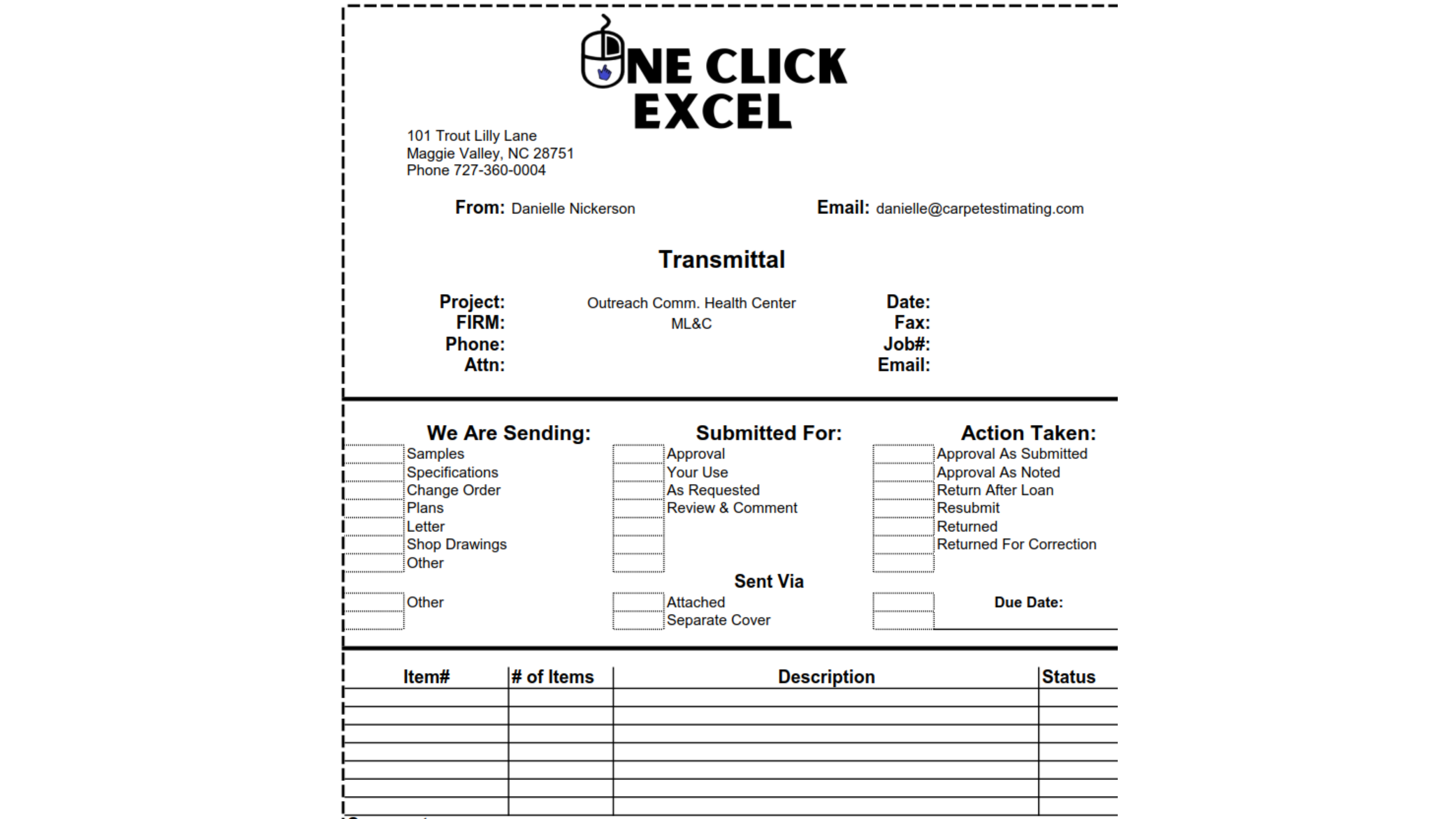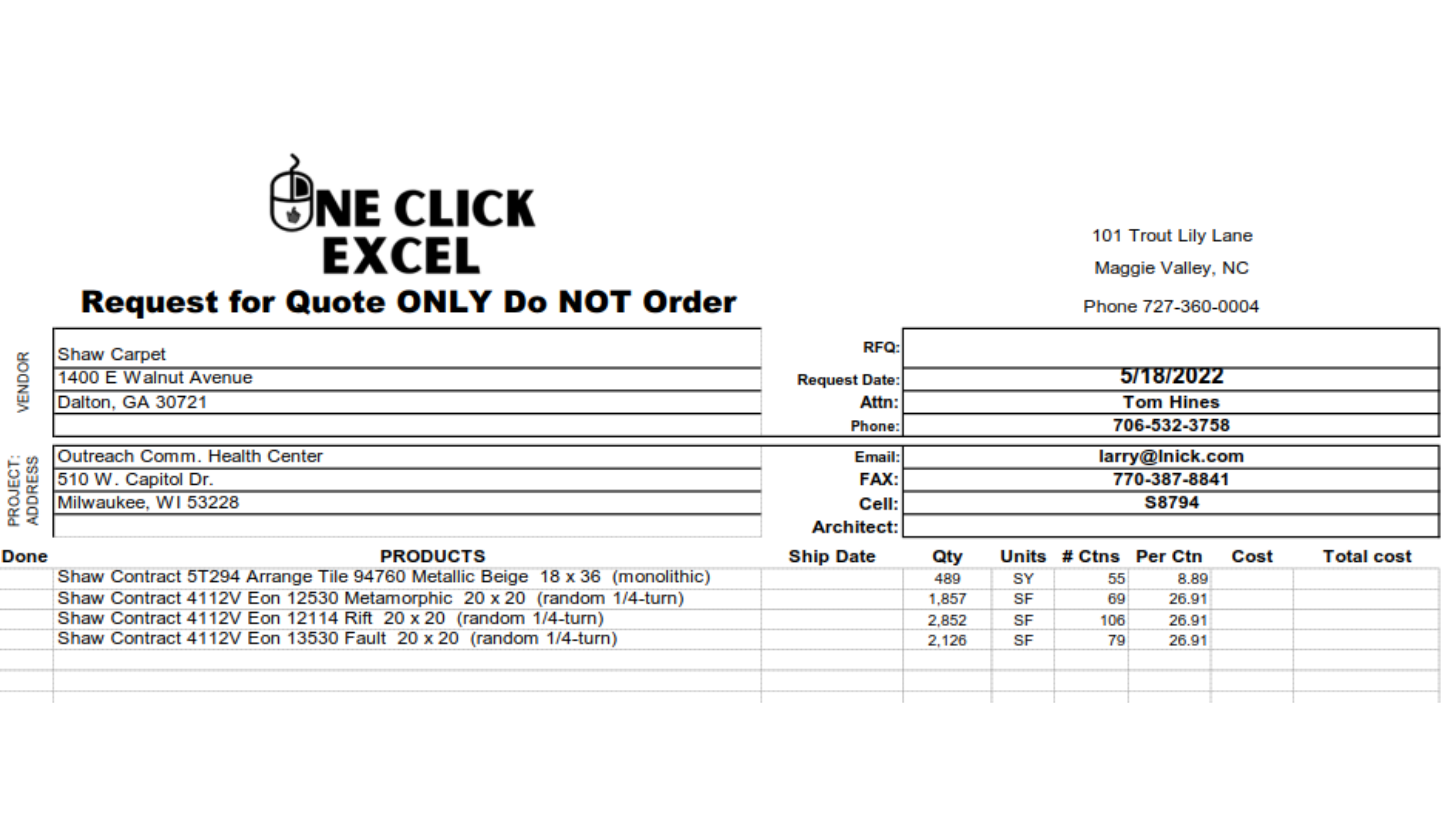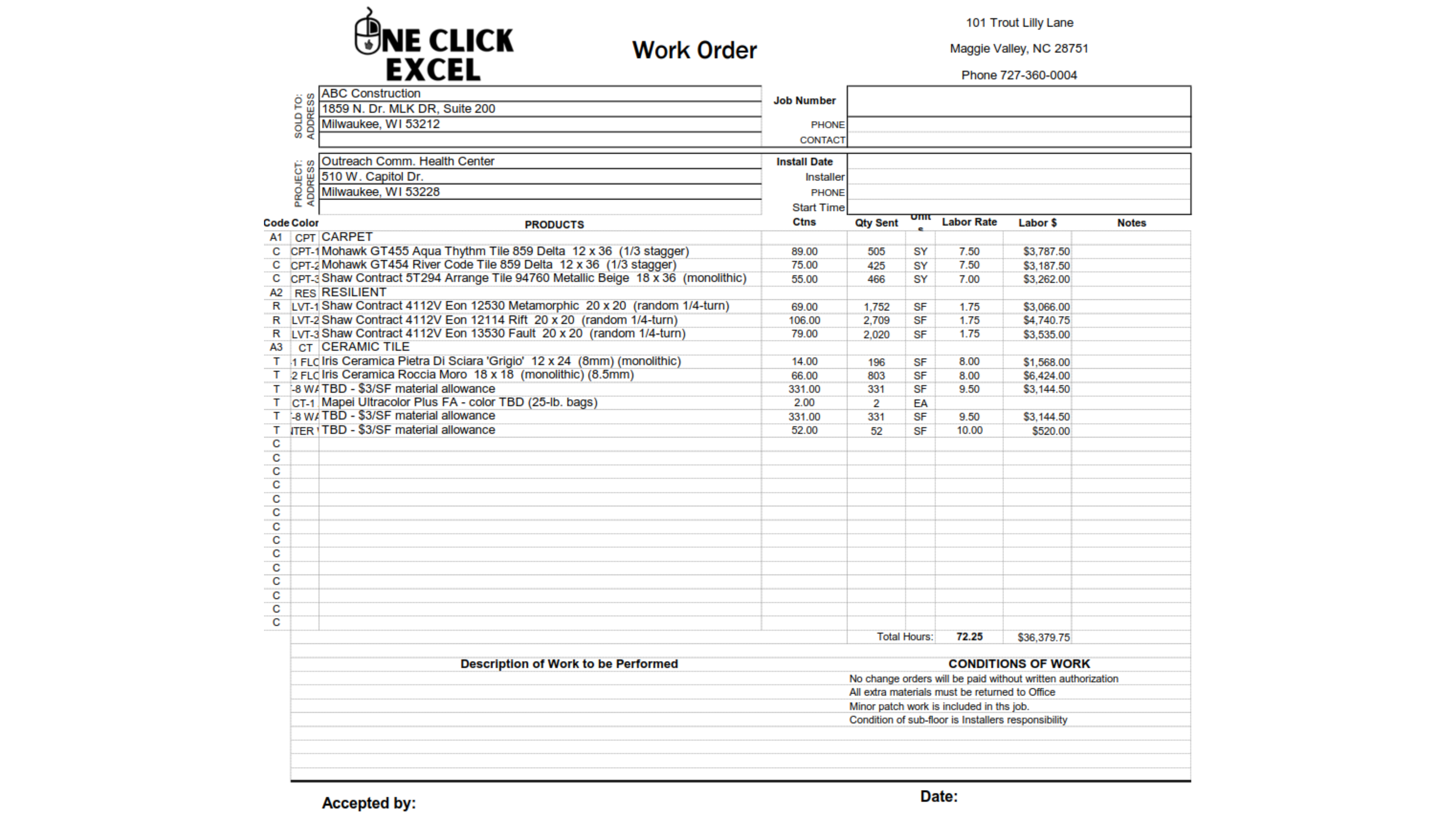 Your One Click Excel will come stocked with all of our premade templates, customized with your company logos and verbiage. Some of these premade templates include terms page, cover letter, fax cover, hourly labor sheet, change order, job notes, work order, purchase order, request for a quote, manual cuts, request for information, transmittal, tile calculator.