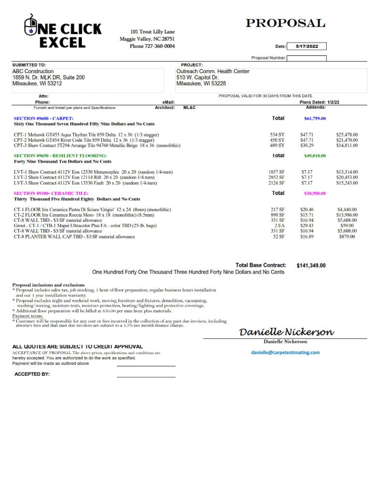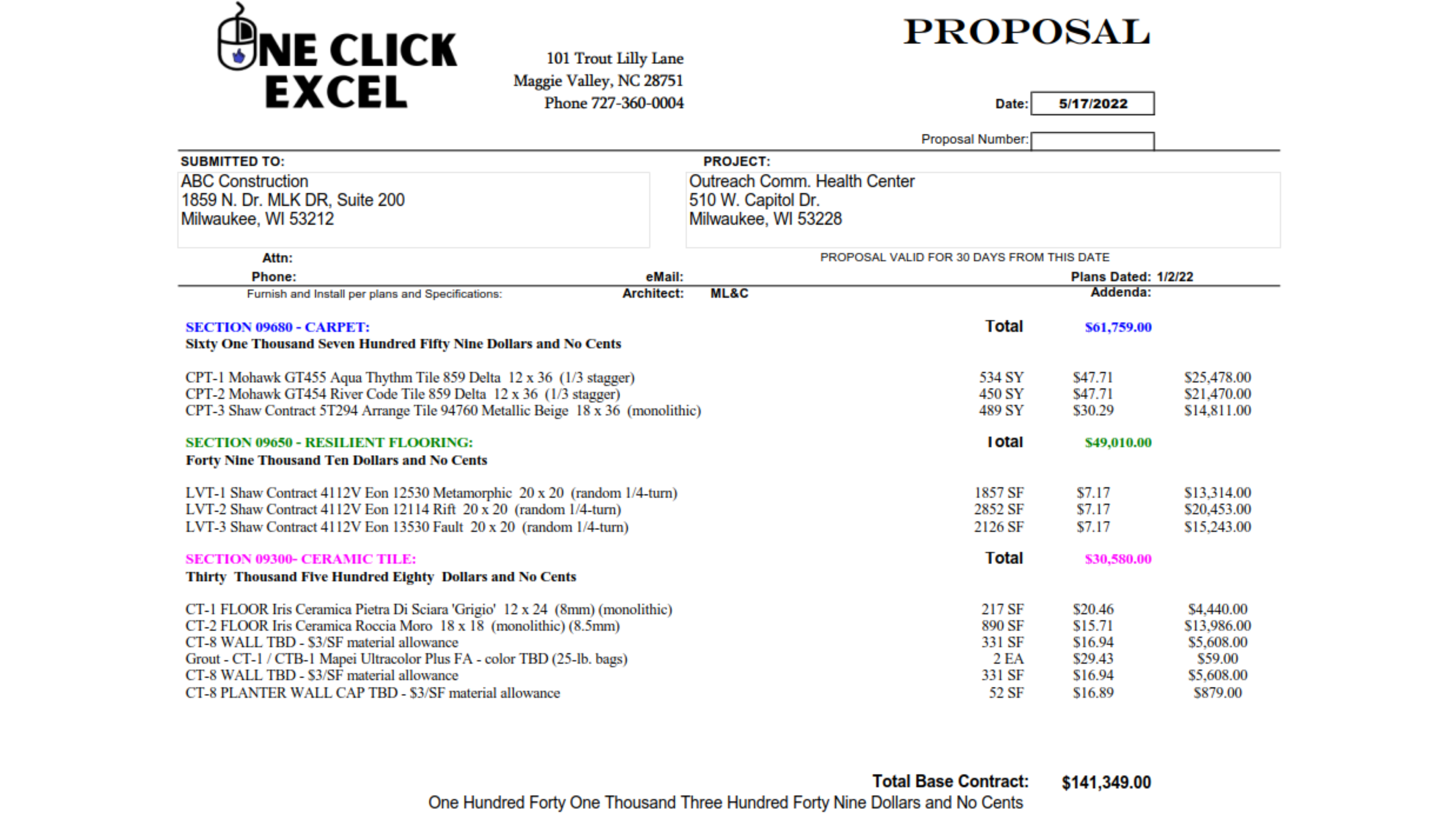 One-Click has multiple different ways to print and send your proposals to clients. Each sheet is fully customizable with your company information, logo, and verbiage.