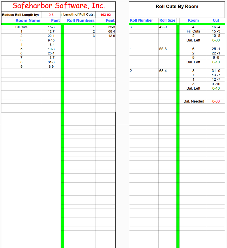 Our roll allocation worksheet instantly calculates all of your cuts and fills on a job. This worksheet is very helpful for use in the warehouse or out in the field. Instant cut size adjustment, and recalculation of materials and waste can be made without going back to the plans.